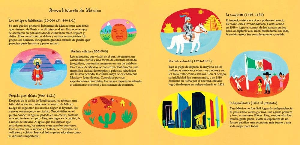 Travel to Mexico and discover its many wonders, from the amazing monarch butterflies in the Highlands to a mariachi show in the village square. The rhyme and lyricism of the text is complemented by endnotes about the history of the country, national fiestas, and a glossary of simple Spanish vocabulary. (Spanish language paperback edition)