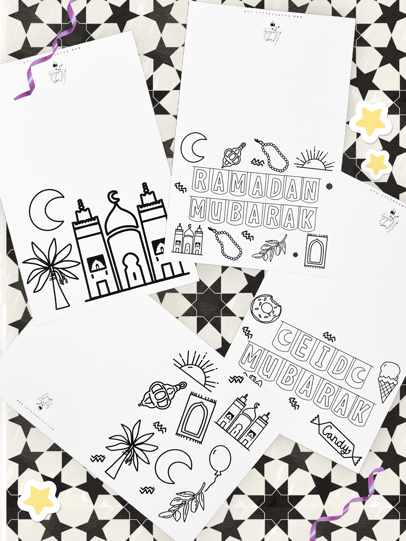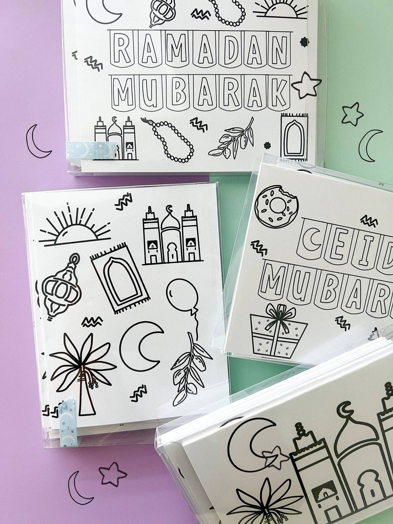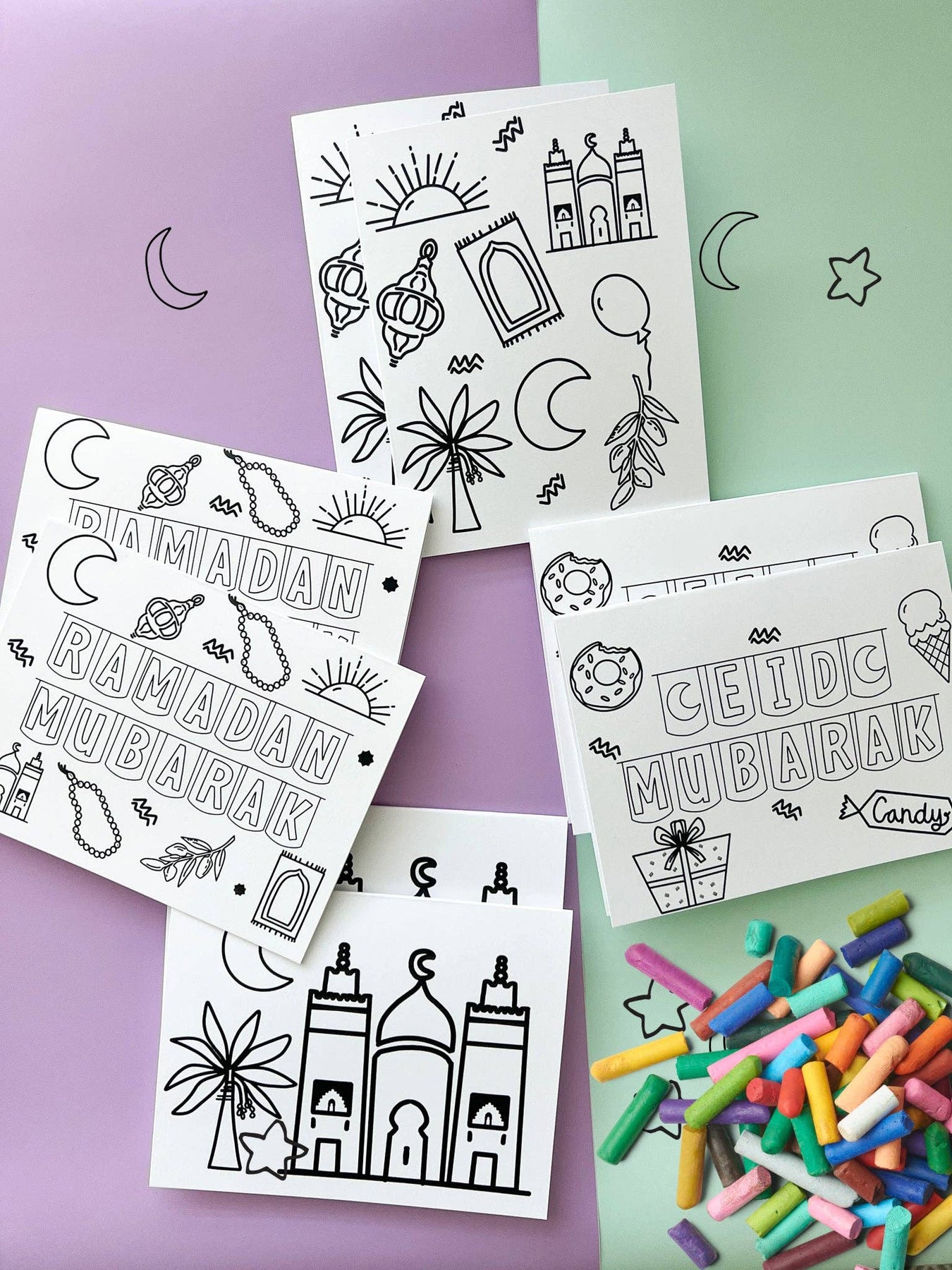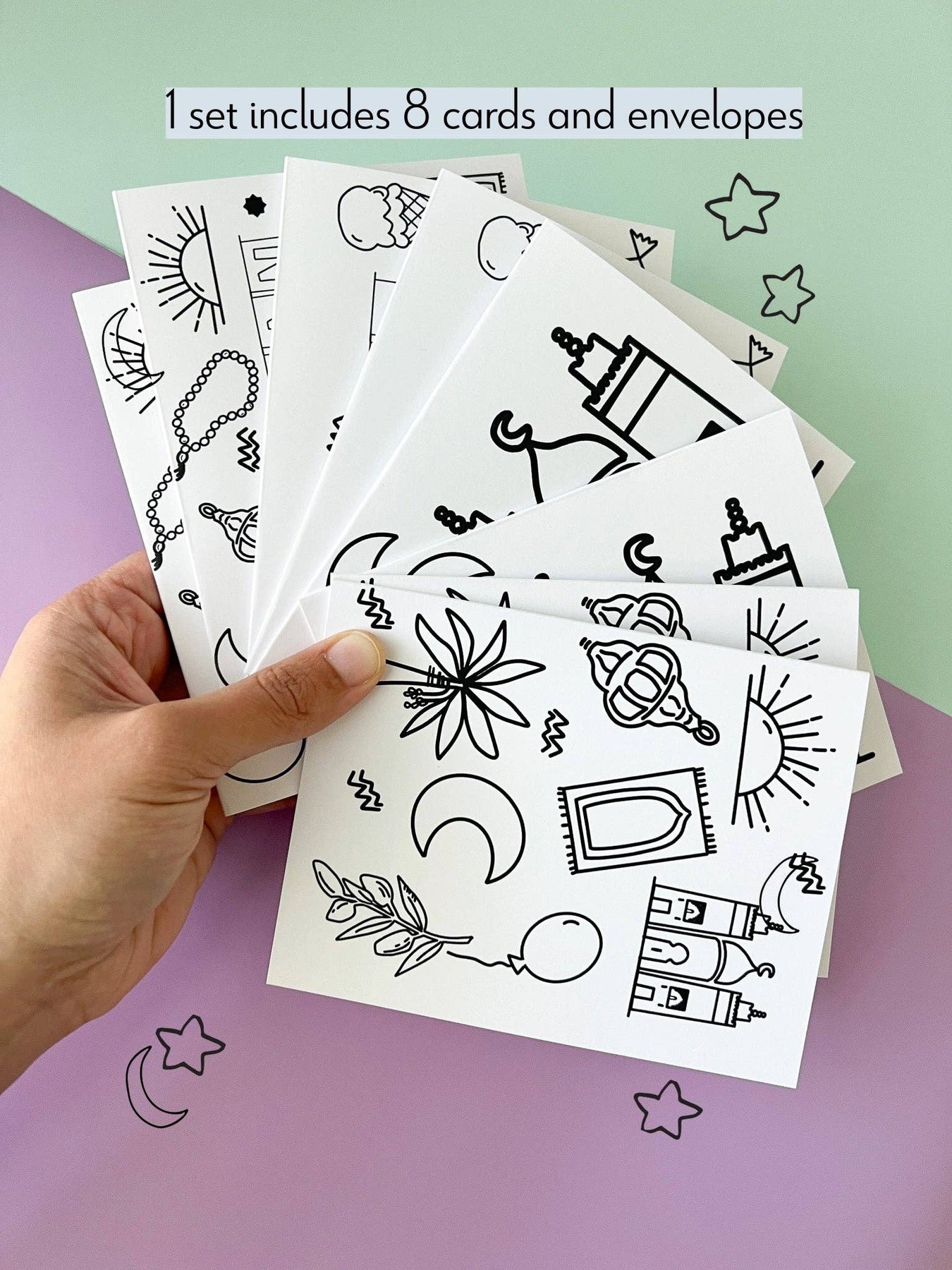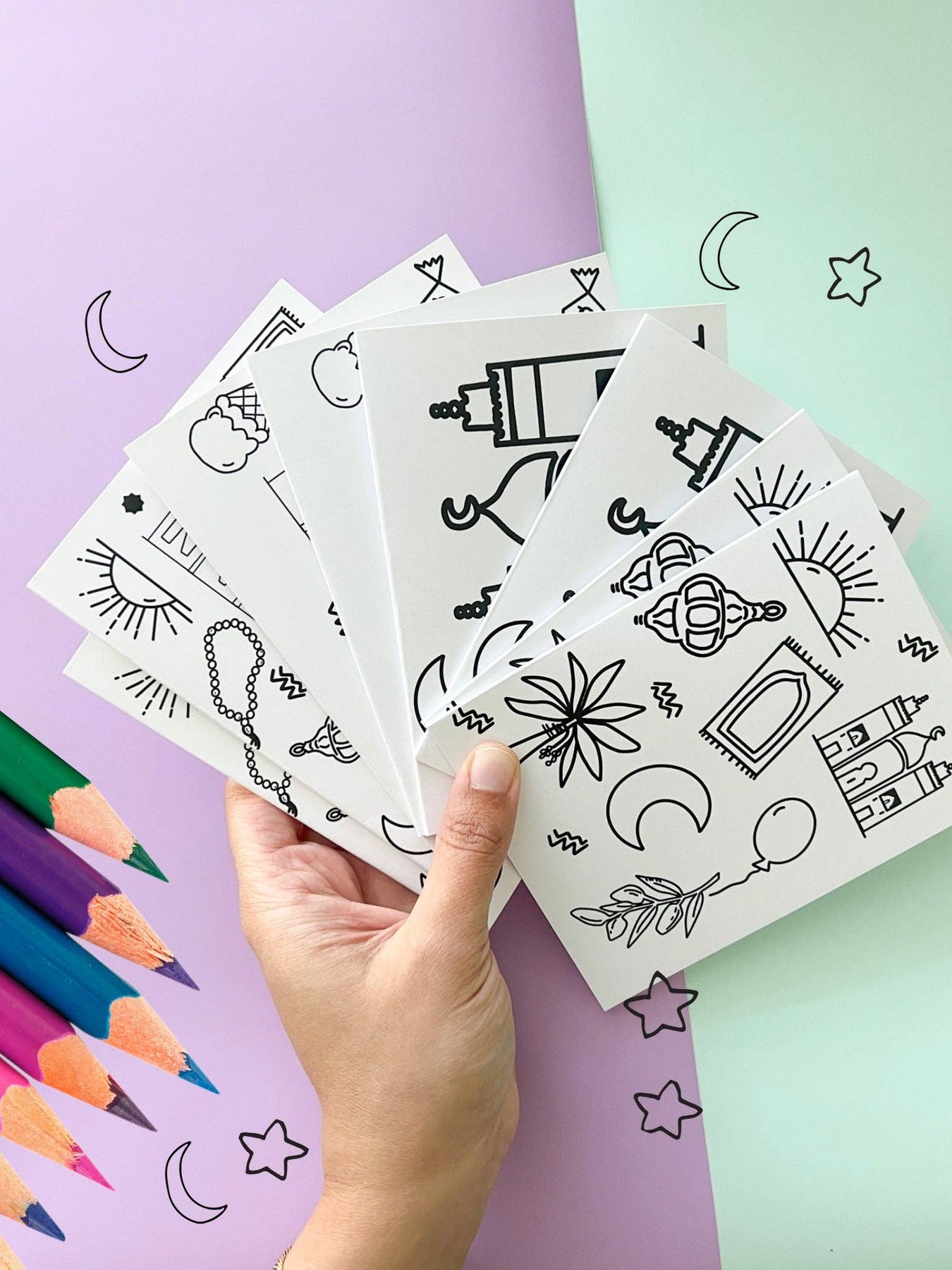 Ramadan & Eid Coloring Cards - Perfect for Kids! Celebrate Ramadan and Eid with creativity and fun! These Ramadan & Eid Coloring Cards let kids color festive designs and create unique greeting cards to share with loved ones. * Set Includes: 8 cards featuring intricate Ramadan and Eid-inspired patterns for kids to color. * 2 Ramadan Mubarak Cards * 2 Eid Mubarak Cards * 2 Islamic Cityscape Cards * 2 Islamic Assets Cards * Packaging: Comes in a clear box with white envelopes * Creative Fun: Keep kids entertained while encouraging their artistic flair during Ramadan and Eid celebrations. All artwork illustrated by Erum Khalili.
