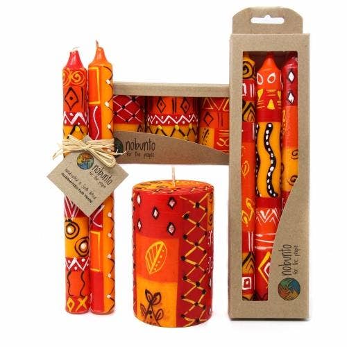 These globally-inspired hand painted candles are small works of art. Crafted by artisans in south Africa, each candle is hand-poured and then individually hand-painted. Each design name is derived from a special African word that is brought to life through the color and patterns which reflect the culture and influences of south Africa. Individually hand painted. Designs will have differences, but will be consistent in colors and icons that reflect the style.