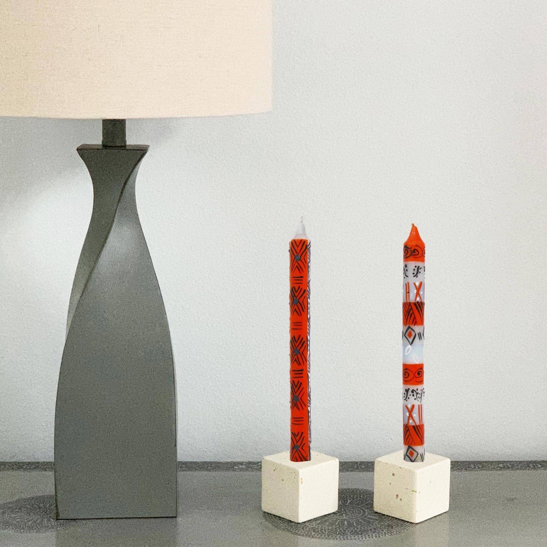 Hand painted dinner candles, set of 3 (Kukomo design). These globally-inspired hand painted candles are small works of art. Crafted by artisans in south Africa, each candle is hand-poured and then individually hand-painted. Each design name is derived from a special African word that is brought to life through the color and patterns which reflect the culture and influences of south Africa. Individually hand painted designs will have differences, but will be consistent in colors and icons that reflect the style. Candles measure approximately 9 inches tall. Unscented, high quality, fully refined paraffin wax from Germany. Non-toxic color pigments and natural wicks. Set of 3 boxed dinner tapers. Burn time averages 10 hours. High melting point of  58°- 60°. Box made from recycled materials. Use care when burning candles: Do not leave a burning candle unattended; snuff out flame when done burning; do not move burning candle; always use a candle holder when burning.