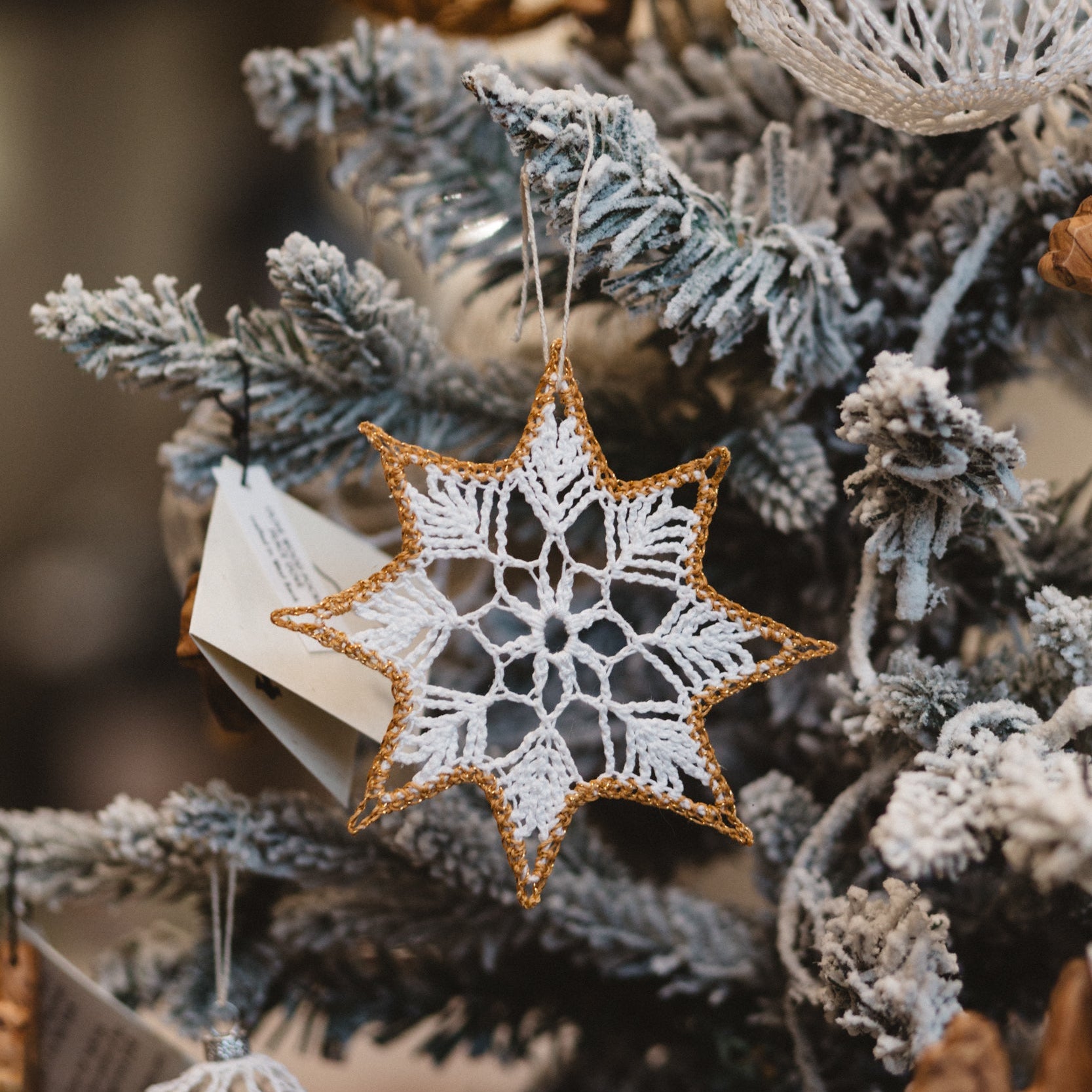 Hand-crocheted in Michigan by Ukrainian refugee artisan Iryna, these delicate cotton snowflakes add timeless charm to your holiday décor. Each ornament is crafted from soft white cotton yarn, featuring intricate designs — one trimmed in silver, one in gold, and one in classic white.